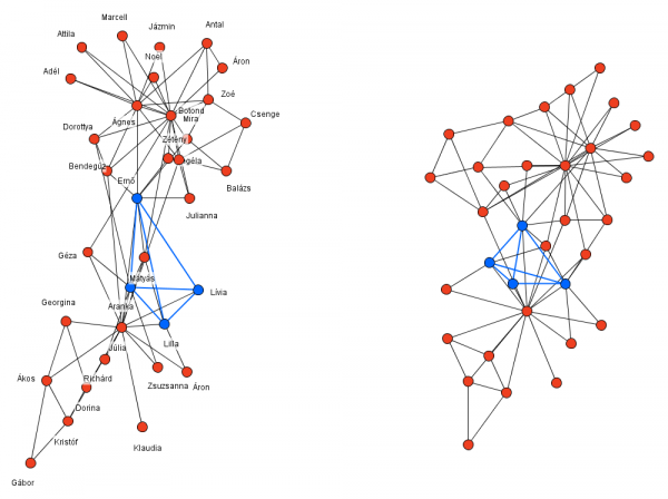 Egy anonimizált (jobbra) és egy kiegészítő információként használt (balra) közösségi hálózat gráfjai. A korábbi algoritmusnak megfelelően két 4-es klikk van kiemelve, amelyek egymásnak feleltethetőek meg.