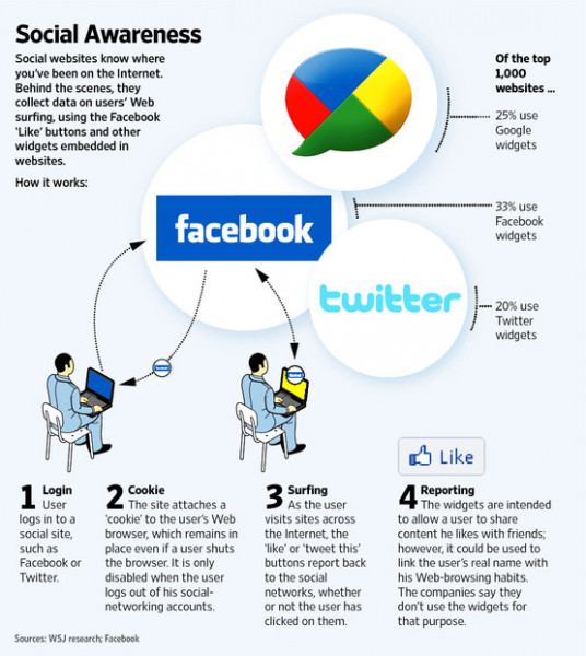 Amikor az új "lájkolós őrület" kezdődött, már felhívtuk Olvasóink figyelmét a Facebook like gomb mögötti veszélyre – konkrétan hogy ezen keresztül a Facebook megfigyel(het)i a bepoloskázott oldalon a tevékenységünk –, és ez a jelenség a sajtóban többször is felmerült már azóta. A Wall Street Journal legutóbbi felmérése szerint súlyosbodó helyzet alakult, figyelembe véve, hogy most már a Google és a Twitter is megjelent hasonló közösségi gombokkal.